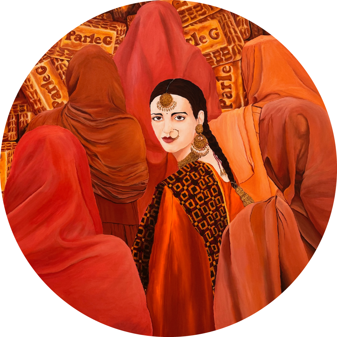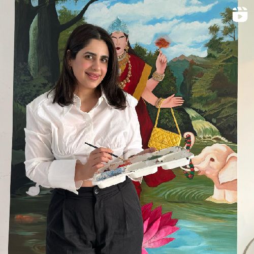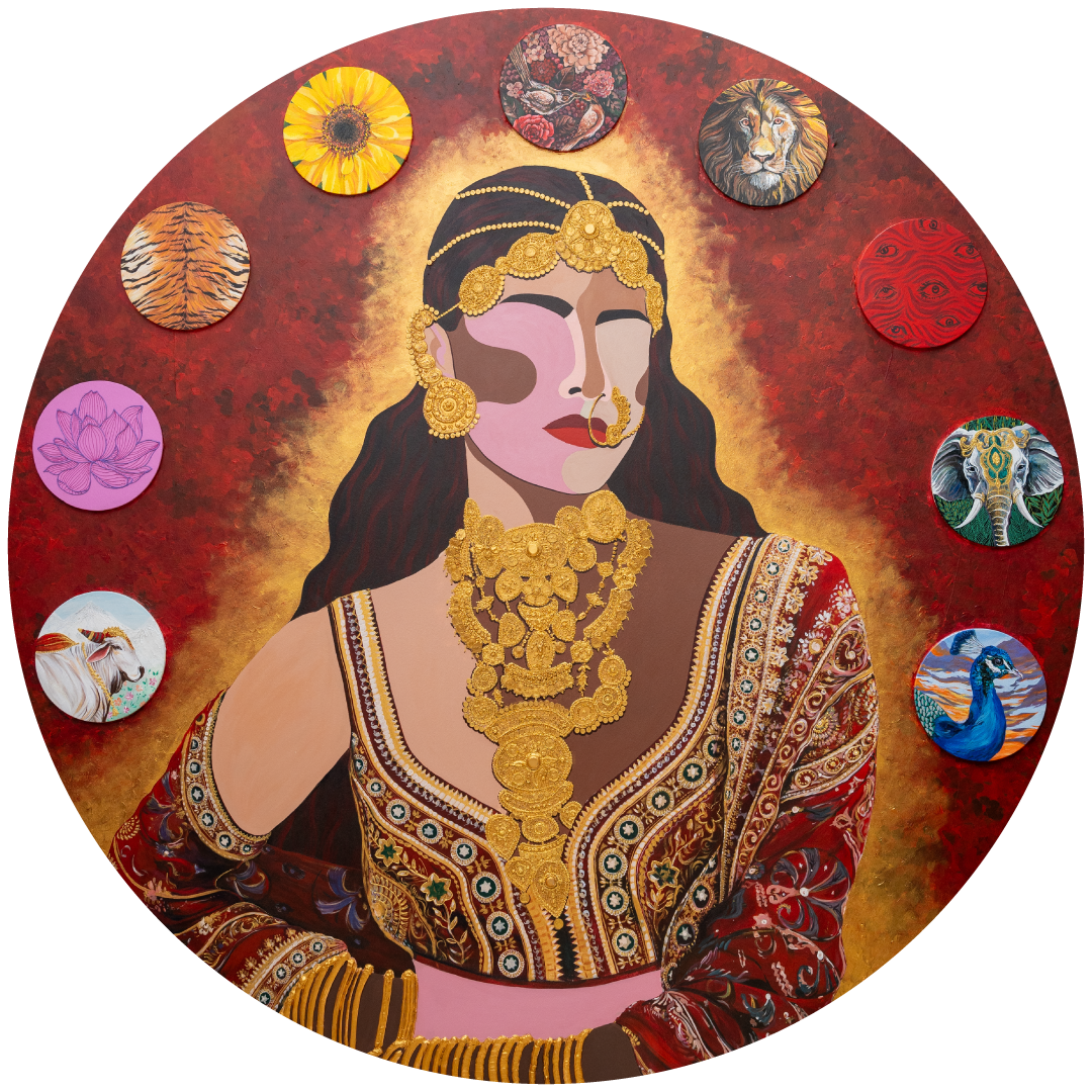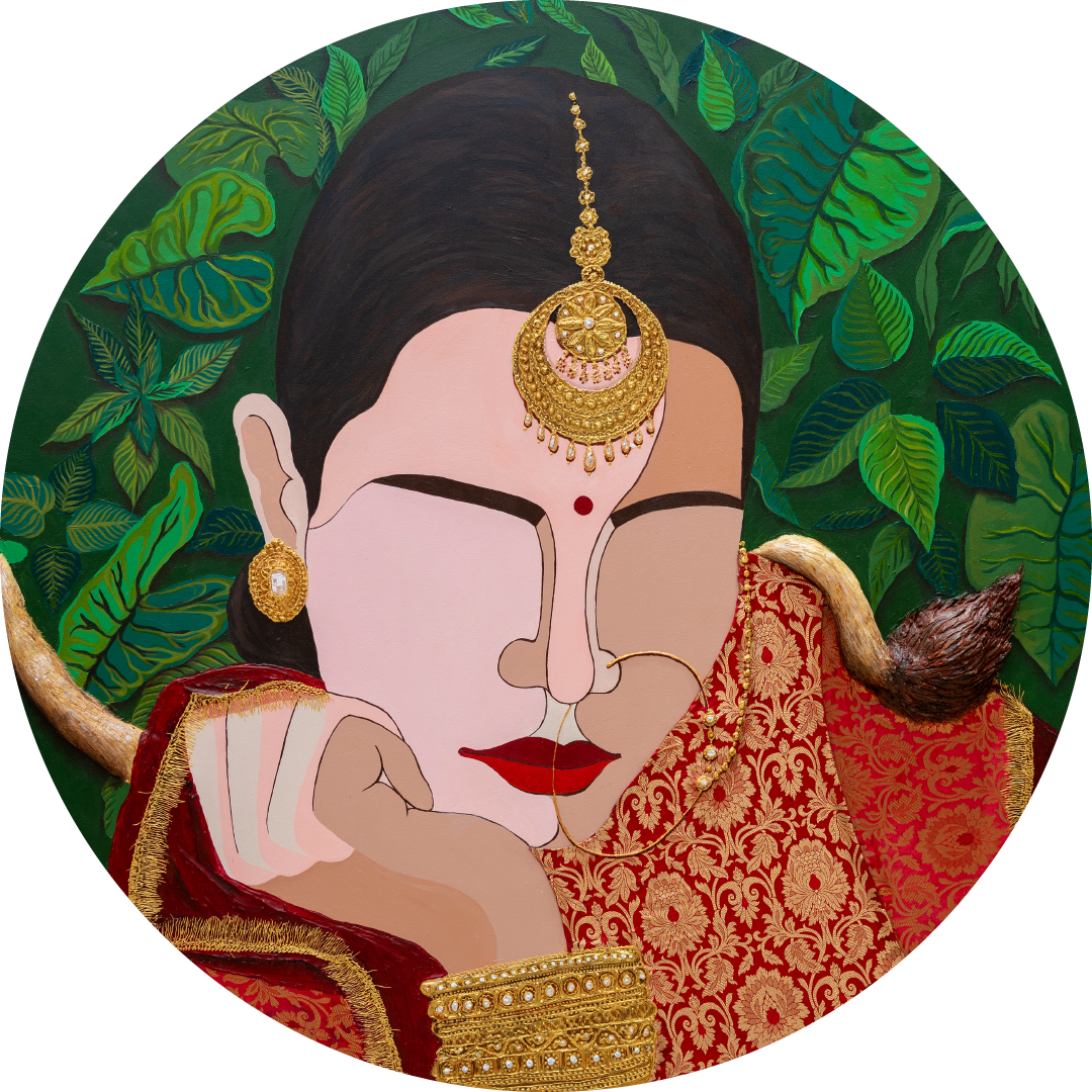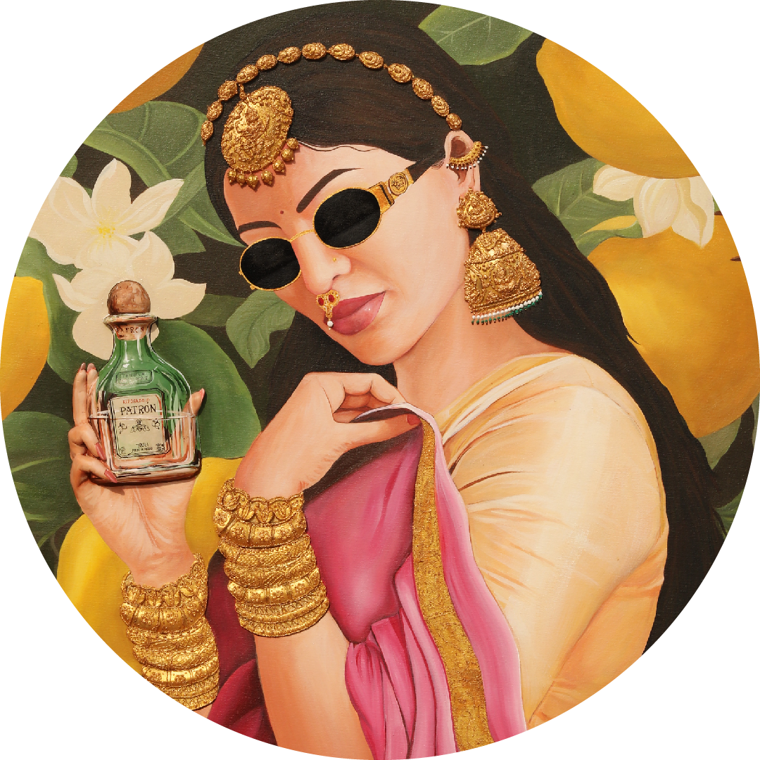 The inspiration of the painting has been taken from Raja Ravi Varma’s classic ‘Woman holding a fruit’ in which he lyrically combines eroticism with innocence.