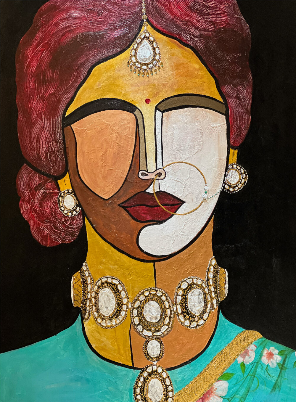 The art you see here is a representation of her state of mind, to bring you closer to how a young girl dreams to be a bride, a Sabyasachi bride, super excited to get dolled up for her big day! The focus remains on the glitter and shine until the reality hits and all you do is sit in silence.