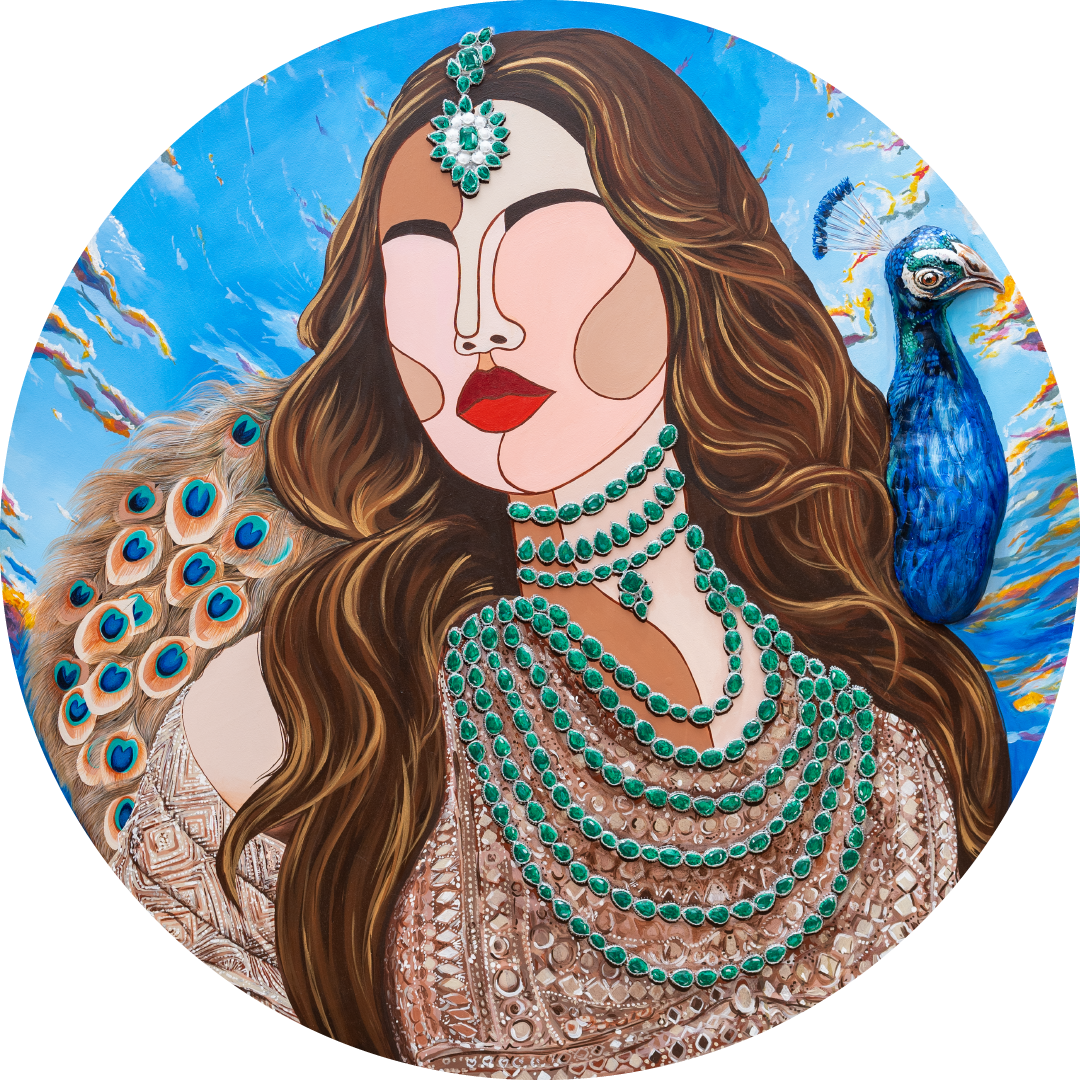 The peacock in the background conveys both patience and unwavering determination as the goddess awaits the fulfillment of her divine purpose.