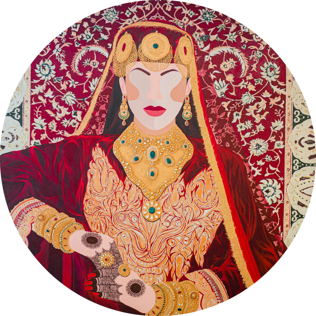 The painting presents a take on Kashmiri women and their strong ambitions mixed with their cultural identity. The woman is seen adorned in heavy ethnic jewellery, traditional ‘phiran’ posing like an empress.